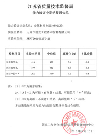 為提高檢測(cè)機(jī)構(gòu)金屬材料室溫拉伸檢測(cè)水平,省質(zhì)量技術(shù)監(jiān)督局在全省范圍內(nèi)組織開(kāi)展了金屬材料室溫拉伸試驗(yàn)?zāi)芰︱?yàn)證工作。 本次能力驗(yàn)證項(xiàng)目為金屬材料室溫拉伸試驗(yàn),試件為鋼筋。參加單位為全省范圍內(nèi)凡資質(zhì)認(rèn)定(計(jì)量認(rèn)證CMA)具有金屬材料室溫拉伸試驗(yàn)檢測(cè)能力的檢測(cè)機(jī)構(gòu)。省質(zhì)監(jiān)局委托國(guó)家工程復(fù)合材料產(chǎn)品質(zhì)量監(jiān)督檢測(cè)中心為技術(shù)支持單位,負(fù)責(zé)能力驗(yàn)證作業(yè)指導(dǎo)書(shū)制定、樣品準(zhǔn)備、驗(yàn)證結(jié)果匯總、統(tǒng)計(jì)分析等工作。 從省質(zhì)監(jiān)局5月13日發(fā)文,6月30日發(fā)放樣品,到7月10日參加能力驗(yàn)證單位完成檢測(cè)活動(dòng),并提交檢測(cè)結(jié)果報(bào)告。8月15日技術(shù)支持單位發(fā)布了本次能力驗(yàn)證計(jì)劃中期結(jié)果通知,無(wú)錫市前友工程咨詢(xún)檢測(cè)有限公司能力驗(yàn)證中期結(jié)果滿(mǎn)意。