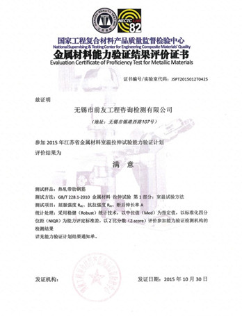 為加強(qiáng)全省檢測(cè)機(jī)構(gòu)的監(jiān)督管理,全面提高檢測(cè)機(jī)構(gòu)金屬材料室溫拉伸檢測(cè)的整體水平,根據(jù)省質(zhì)量技術(shù)監(jiān)督局蘇質(zhì)監(jiān)認(rèn)函[2015]12號(hào)文的要求,國(guó)家工程復(fù)合材料產(chǎn)品質(zhì)量監(jiān)督檢驗(yàn)中心作為技術(shù)支持單位,于2015年5月~10月在全省范圍內(nèi)實(shí)施了金屬材料室溫拉伸試驗(yàn)?zāi)芰︱?yàn)證活動(dòng)。 元月22日,在南京召開(kāi)了江蘇省金屬材料室溫拉伸能力驗(yàn)證結(jié)果通報(bào)會(huì)暨檢測(cè)技術(shù)交流會(huì),會(huì)議內(nèi)容有:實(shí)驗(yàn)室資質(zhì)認(rèn)定要求及評(píng)審準(zhǔn)則解讀;2015年全省金屬材料室溫拉伸試驗(yàn)?zāi)芰︱?yàn)證結(jié)果通報(bào);金屬材料室溫拉伸試驗(yàn)關(guān)鍵因素解析與試驗(yàn)控制;實(shí)驗(yàn)室認(rèn)可與能力驗(yàn)證;發(fā)放能力驗(yàn)證結(jié)果報(bào)告和證書(shū)。 公司派代表參加了會(huì)議,領(lǐng)取了金屬材料能力驗(yàn)證結(jié)果評(píng)價(jià)證書(shū),評(píng)價(jià)結(jié)果為滿(mǎn)意。