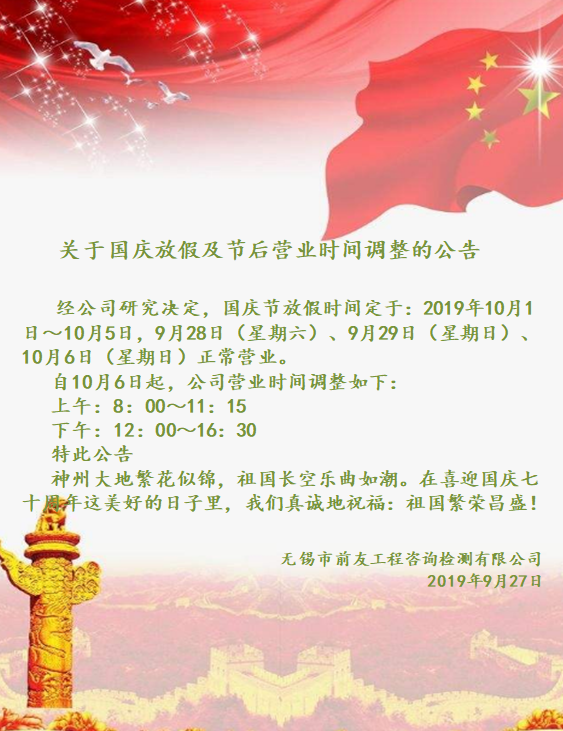 關(guān)于國(guó)慶放假及節(jié)后營(yíng)業(yè)時(shí)間調(diào)整的公告