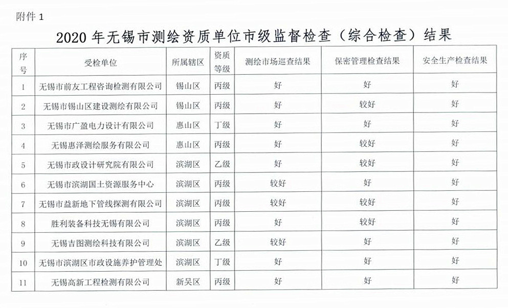 | 2020年無(wú)錫市測(cè)繪資質(zhì)單位市級(jí)監(jiān)督檢査結(jié)果出爐 | ||