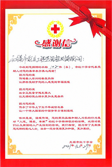 為進(jìn)一步踐行社會(huì)主義核心價(jià)值觀(guān),大力弘揚(yáng)“人道、博愛(ài)、奉獻(xiàn)”的紅十字精神,倡導(dǎo)“互助、環(huán)保、節(jié)能、公益”的社會(huì)理念,根據(jù)市委市級(jí)機(jī)關(guān)工委、市文明辦、市紅十字會(huì)《紅十字愛(ài)心衣物捐贈(zèng)倡議書(shū)》精神,我公司積極組織,大家踴躍捐出款式新、質(zhì)量好的衣物并主動(dòng)利用節(jié)假日期間對(duì)所捐衣物進(jìn)行清洗、晾曬、消毒,確保捐贈(zèng)的愛(ài)心衣物符合要求,并于2021年1月29日下午將所捐衣物送至無(wú)錫市紅十字會(huì)。