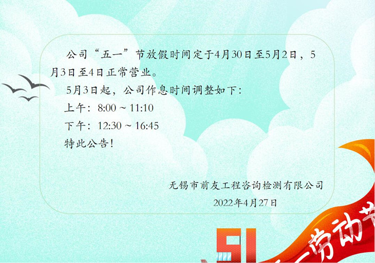 關(guān)于“五一”勞動(dòng)節(jié)放假及節(jié)后營(yíng)業(yè)時(shí)間調(diào)整的公告