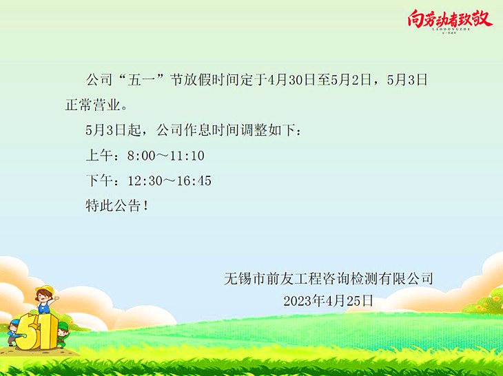 | 關(guān)于“五一”勞動(dòng)節(jié)放假及節(jié)后營(yíng)業(yè)時(shí)間調(diào)整的公告 | ||
