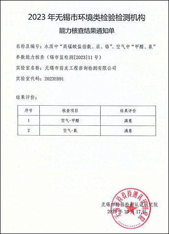 | 公司獲2023年無(wú)錫市環(huán)境類(lèi)檢驗(yàn)檢測(cè)項(xiàng)目能力核查滿(mǎn)意結(jié)果 | ||