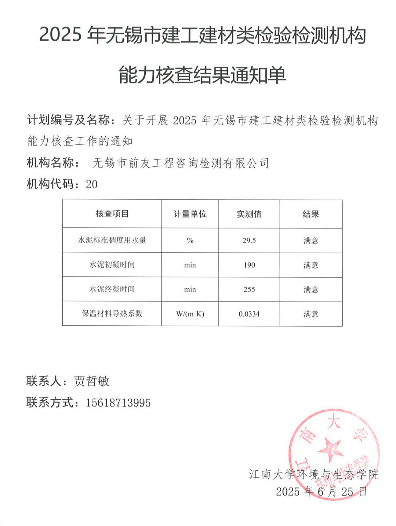 本次能力核查,無(wú)錫市前友工程咨詢(xún)檢測(cè)有限公司均獲得滿(mǎn)意結(jié)果。